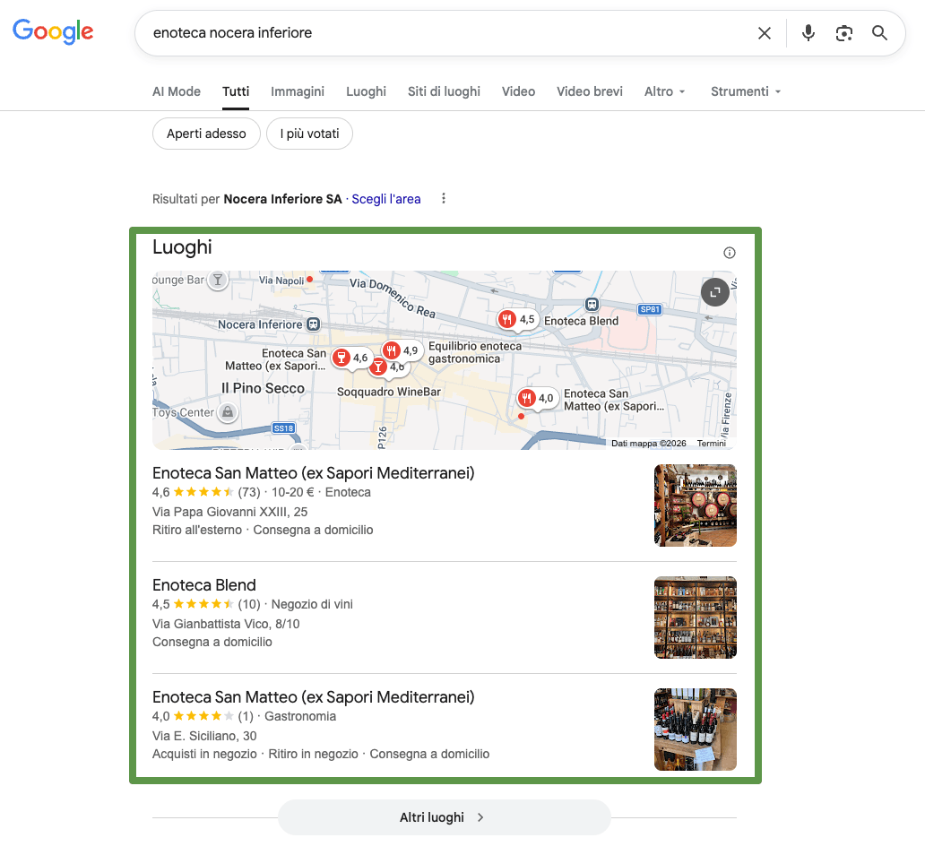 Questa area mostra in cima ai risultati di ricerca una mappa interattiva affiancata da un elenco ristretto di attività commerciali locali pertinenti alla ricerca effettuata.
